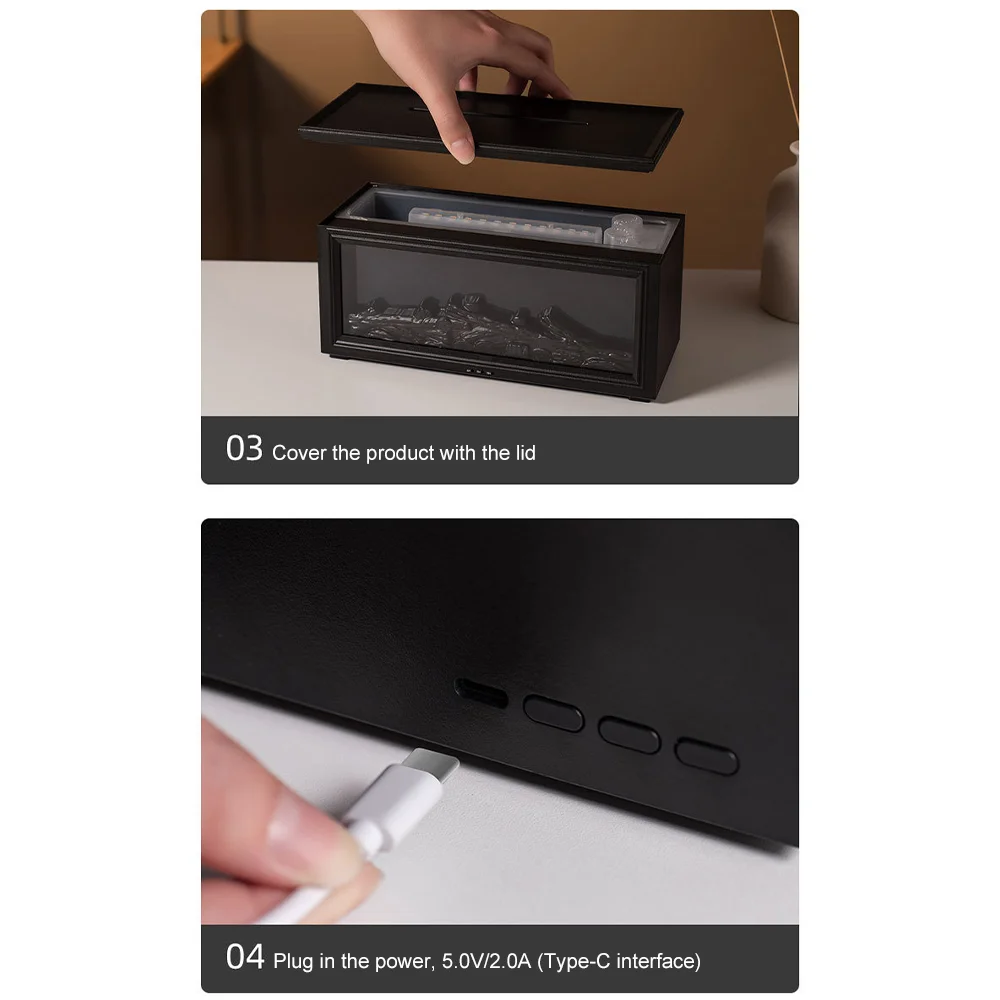 The Colourful Flame Fireplace Aroma Diffuser combines ultrasonic mist technology with a realistic multi-colour flame light effect to create a warm and relaxing atmosphere. Designed for tabletop use, this USB-powered diffuser releases fine mist while LED lighting simulates a fireplace-style flame.